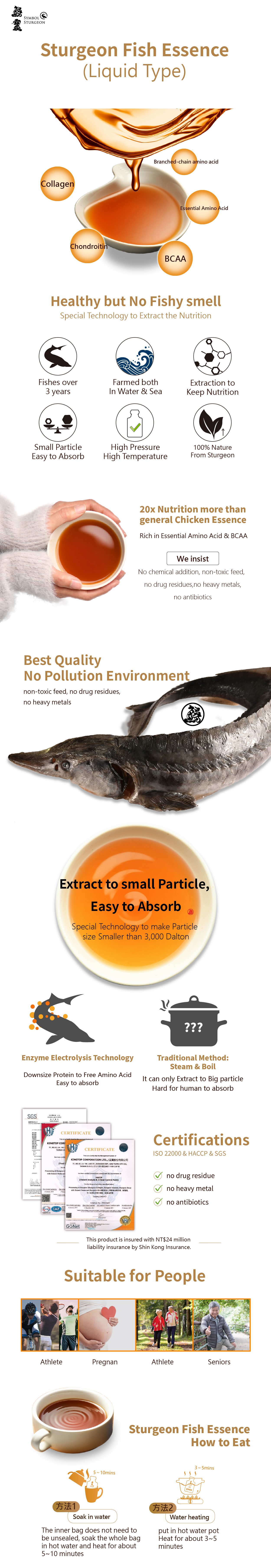Selected from Taiwan's Yilan, the sturgeon is carefully chosen to ensure high concentration and purity, with zero fat for a guilt-free and top-quality source of nutrition. The secret to its nourishing benefits lies in its small molecular size, which allows for efficient absorption and regulation of